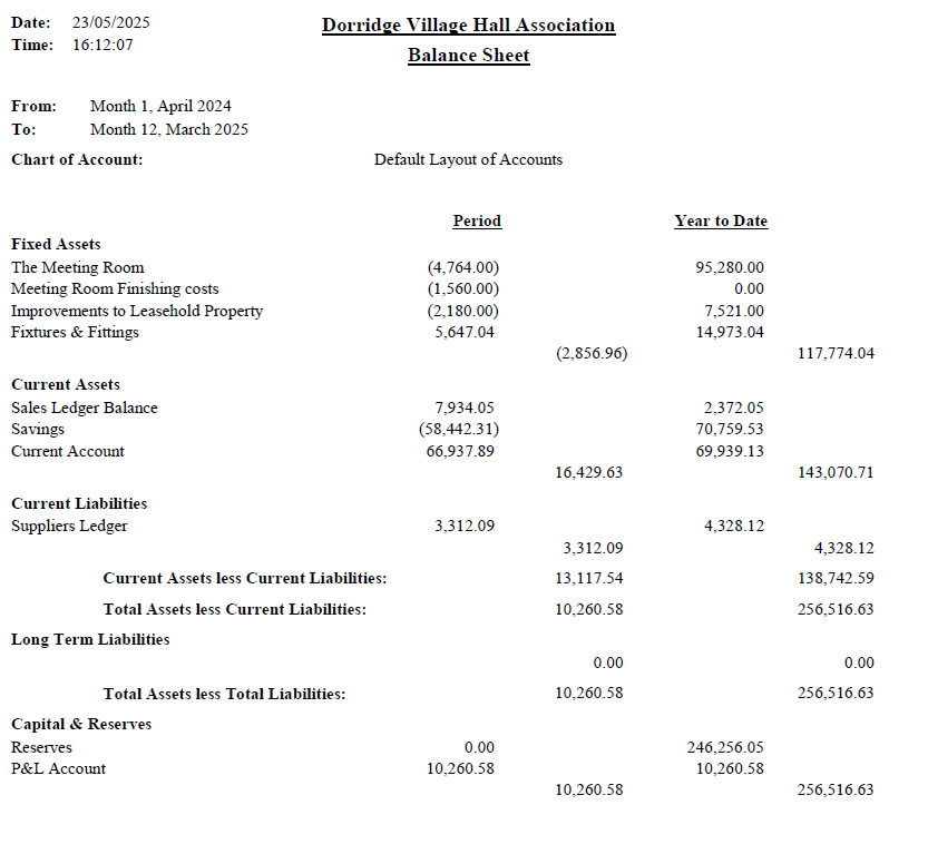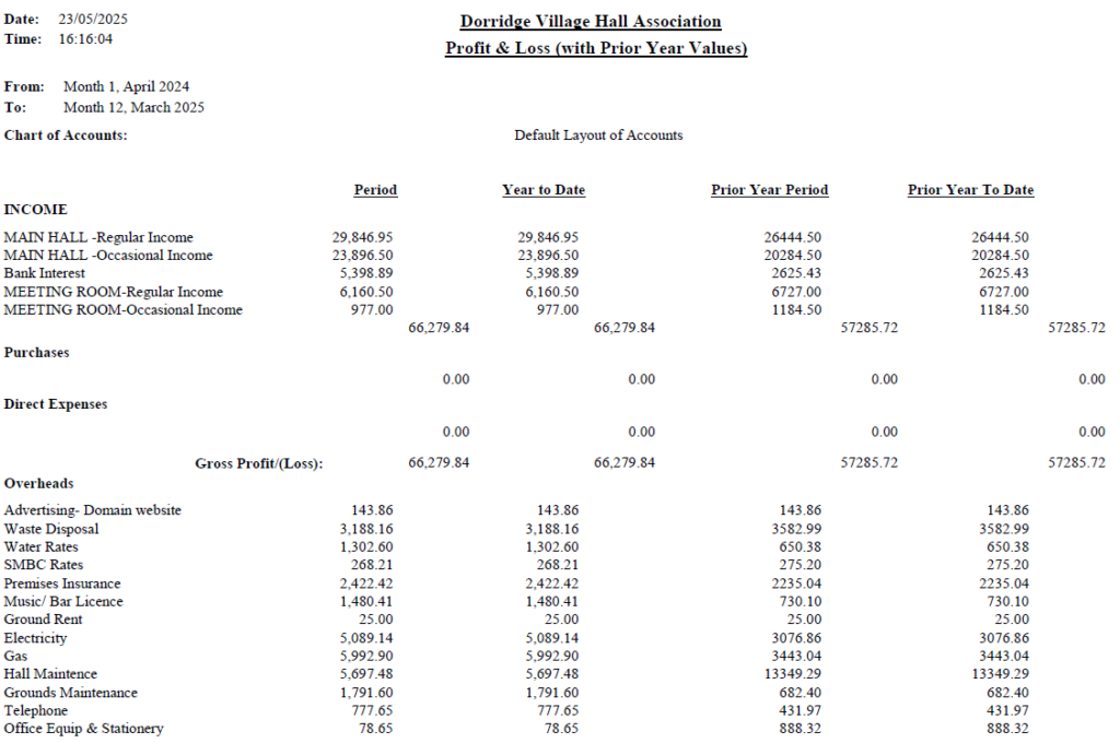 Last year it was indicated that we had been consulting with Hallmaster, with a view to using their system to undertake some of our administration tasks, particularly invoicing and bookings. So far the Hallmaster system has been working well for us, with a greatly reduced administrative burden. We must thank Rodger Lawrence, Christine Price and Ed Mathews who retired from the Executive Committee at our Annual General Meeting in August 2024, and welcome Katherine Leach, David French, Steve Patrick, Daivd Wright, Fran Baxter, Paul Froggett, and Neerja Danona who joined the Executive Committee at that AGM. Subsequently Barbara Garcia and Steve Patrick stood down and we express our thanks to them too. Finally, our then Chair, Barabara Massey, stood down for family reasons in November after 17 years in the role, and we all owe a huge debt of gratitude to her for all that she did in those years. Robert Beckham was co-opted as Chair in her stead. We thank Marilyn Froggatt and Bob Tabb for their continued efforts on the Executive Committee, and although not now formally a member of the Executive Committee, Barabara Massey continues to work with our bookings team to show prospective hirers of facilities We would also like to thank David Hawkin for his help during the year particularly with IT support. signed 17 July 2025 Robert Beckham Chair – Dorridge Village Hall AssociationFinancial Review